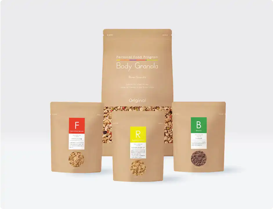 腸内フローラの主要な菌が好んで食べる素材(プレバイオティクスなど)が配合されたグラノーラを開発。あなたのカラダに合わせて3つ選び、ベースになるグラノーラと混ぜるだけで、あなたにぴったりのグラノーラが完成。