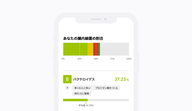 さらに、日本人全体における割合もわかるため、自分の腸内環境がどのような位置づけにあるのかを客観的に把握できます。